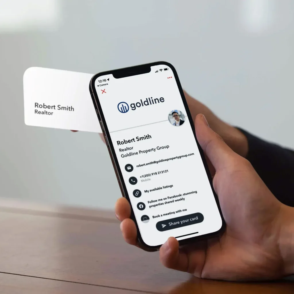 All of the Mobilo cards are equipped with an NFC chip. This enables sharing or exchanging your contact details with just a tap. No app is needed for this to work and it works with both iOS and Android phones from 2018 and newer.
